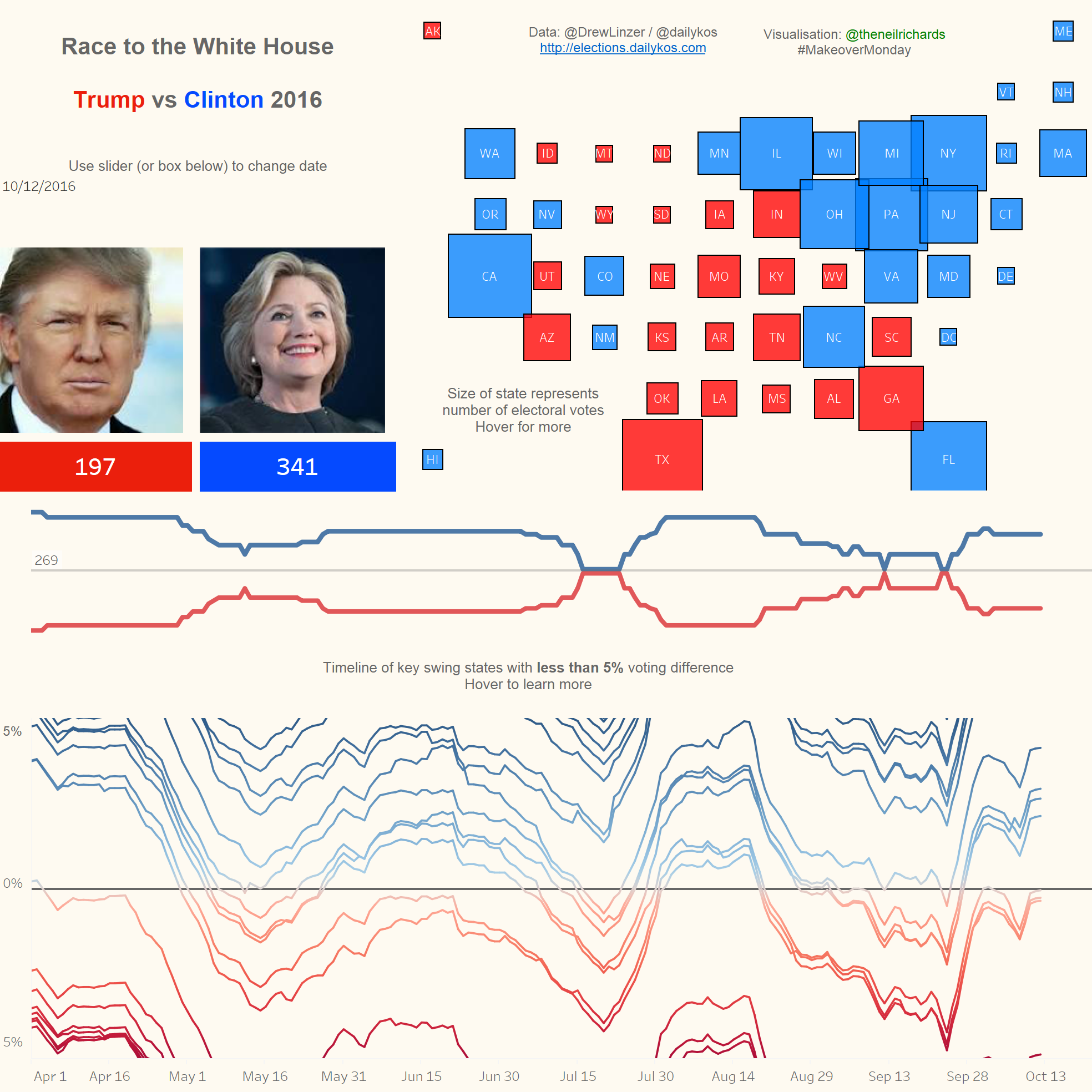 There are so many fantastic visualisations from before election night, all showing the lie of the land at the time, all allowing the reader to decide whether the most likely winner would be Trump or Clinton.