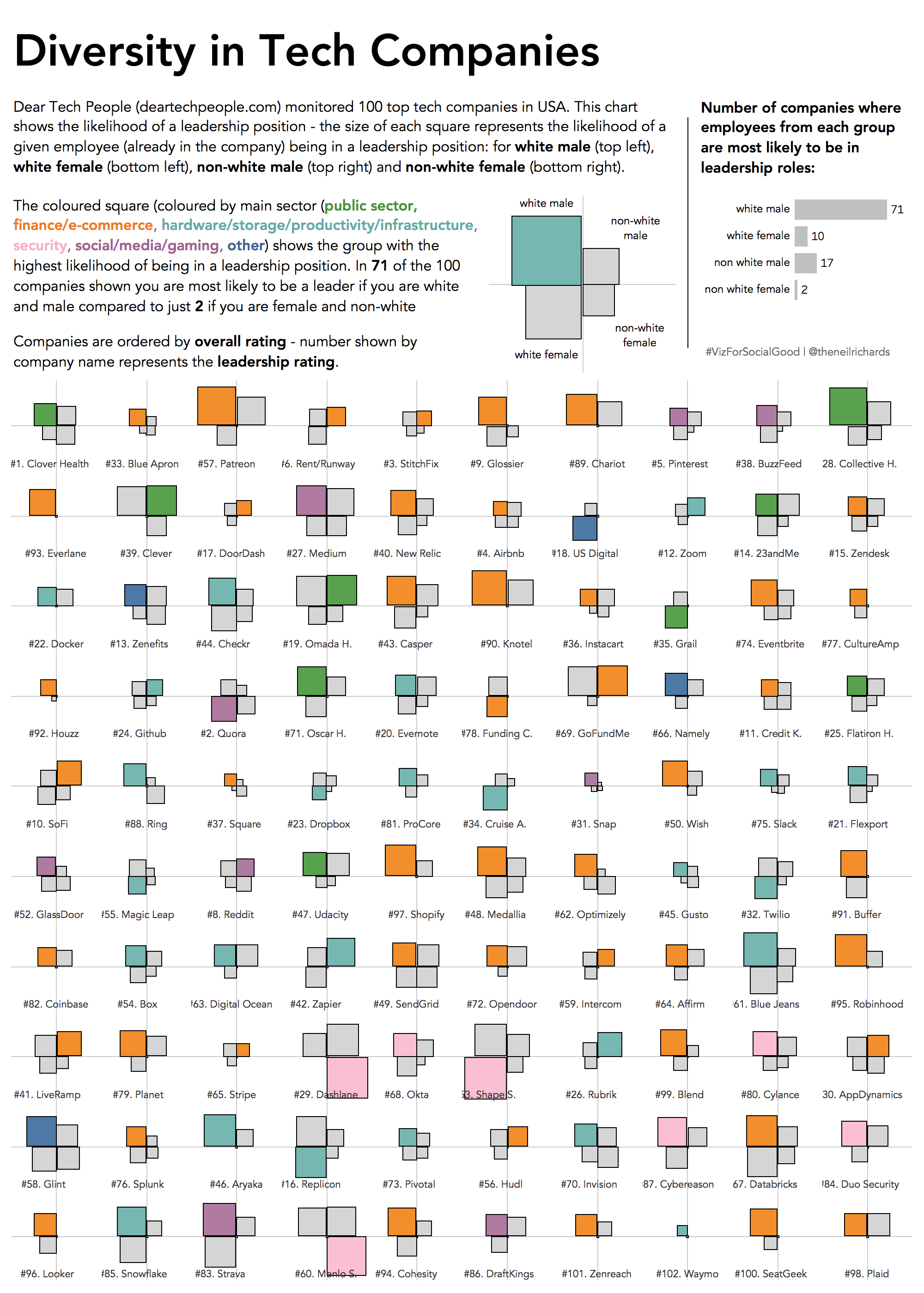 Next was some feedback from Fi Gordon (@vizchic) who wondered if absolute numbers would be more appropriate. Is using percentages misrepresenting the sample, showing 1 non-white female from 5 in the same prominence as 200 white males from 1000? I didn’t make any changes as a result of this but I didn’t disagree, and did appreciate the discussion. It’s a discussion point and a potential downside, though in order to represent likelihood of reaching leadership roles I felt I had to go down the route I had done.