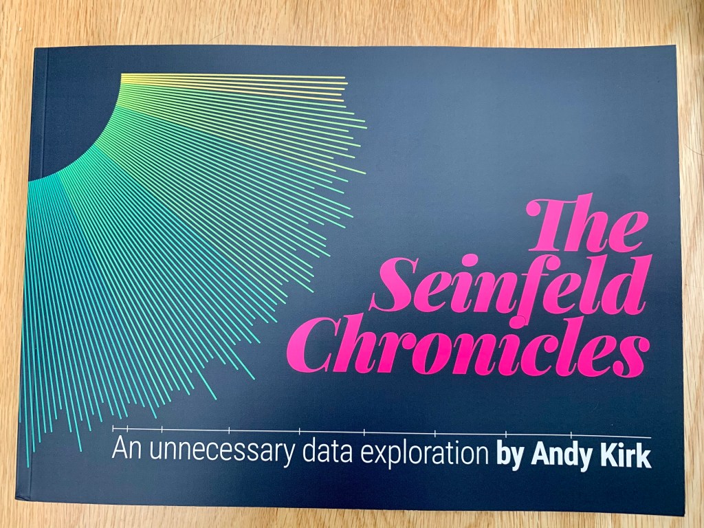 Times are hard right now – we are all living through the protracted elections and global pandemics that our industry are visualising. And if your mental health benefits less from being immersed in these issues and more from escapism, then join me in visualising a wide array of meaningful or meaningless issues, in ways as conventional or unconventional as you enjoy most. And share them – there will always be those who enjoy your output. After all, I know very little about Seinfeld (when I received the book with a note addressed “Hello Nooooman”, I thought I’d got some other guy’s book – there, I’ve admitted it!), but I loved Andy’s joy and enthusiasm expressed through data visualisation in his book – and I know a little more about Seinfeld now!