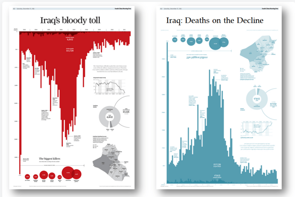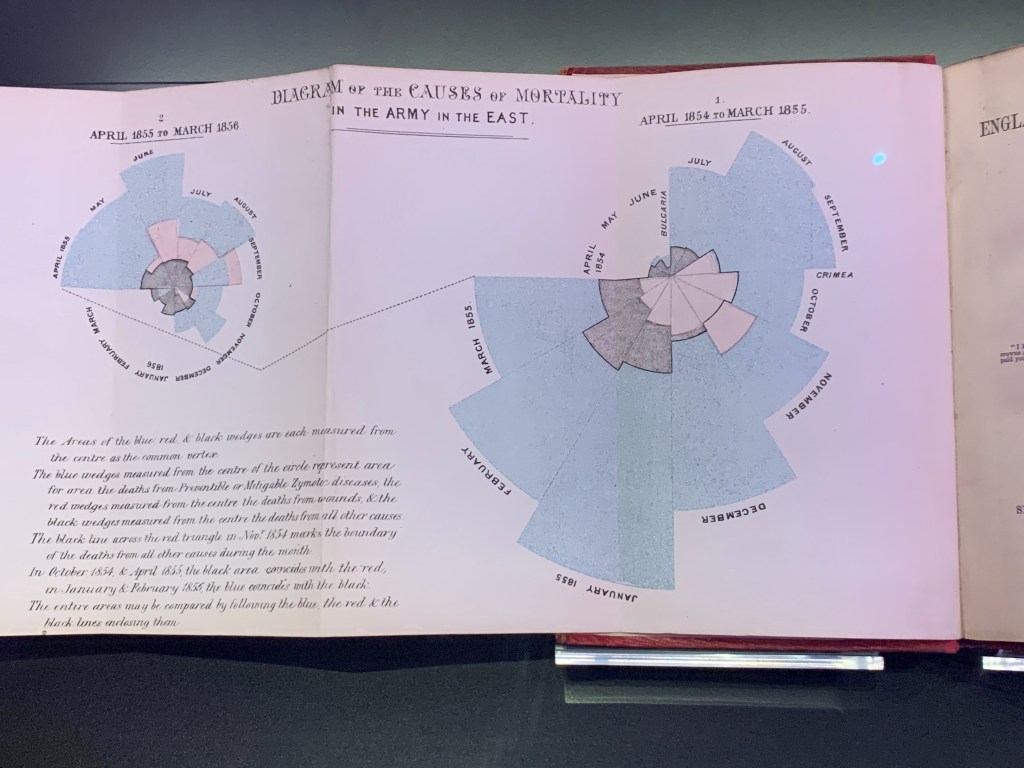 Returning to the chapter on data visualisation – I’ve shown Andy Cotgreave’s seminal re-working of “Iraq’s Bloody Toll” above, which if you’re not familiar with it, is definitely worth reading about on his blog, how orientation, framing, colour and font choice can almost completely reverse the story a visualisation is trying to tell. But it’s also worth calling out Florence Nightingale’s coxcomb/rose visualisations. Below is my own photo, taken at the Science Museum in London, of Nightingale’s viz, which has survived only as a fold-out appendix/frontispiece in a book on the Crimean War by Harriet Martineau, in order to get her visualisation in front of as many eyes as possible, the “vulgar public”.