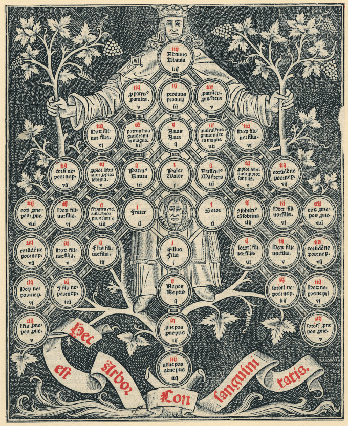 And as a flavour of its content – see below for two sample images. The first from mediaeval times shows a tree structure to represent family relationships, and the second from modern times is a radially stylised image. Both are similar in that they represent family “branches” but are worlds apart in design (with different categories in the taxonomy above).