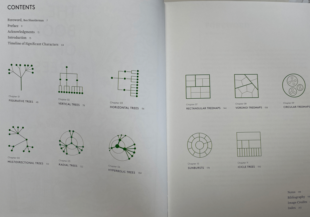What I loved about the Book of Circles was its content page, which also acted as a really convenient taxonomy of all the circular chart types. And the Book of Trees has exactly the same thing which is every bit as useful. Perhaps even more so, because it’s here that I realised that the tree element of many of the images is more metaphorical. These charts are, as described in the book’s subtitle (and this blog post’s title), looking at branches of information. So we see a wide variety of types, from tree-style visuals through radial trees to tree maps and even sunburst charts. So it’s actually quite pleasing to see a crossover between the two books where the radial forms are considered. This therefore leads to a particularly wide range (and large collection) of charts, visualisations and images as inspiration, or just to consume for pleasure.