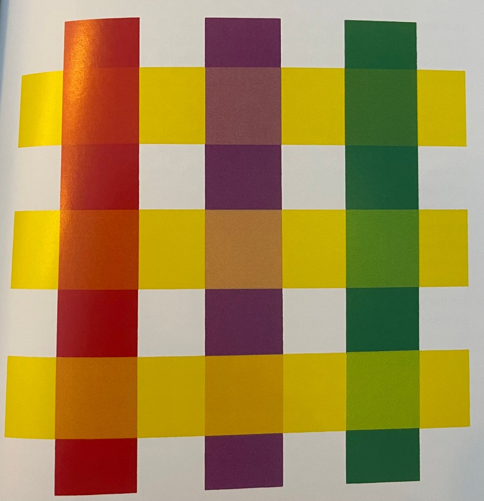 So I’ll illustrate the value of the book with two examples (with the caveat that these are, intentionally, low quality phone copies from the book). Albers illustrates the potential colour illusions when crossing dark colours with light (clearly this was designed long before computers and RGB codes). The three yellow strips are identical colours, but when they cross the darker colours they are assigned mixed colours that are dark, medium and lighter mixes respectively.