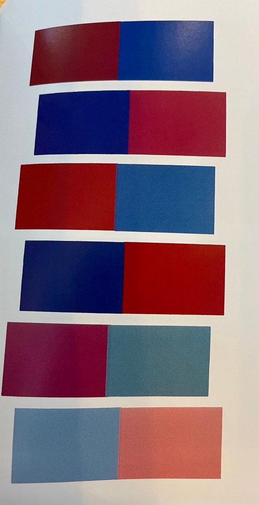 The second example that caught my eye was below: Albers challenges the association of red and blue with “warm” and “cold” by alternating red/blue left/right and right/left pairs below. He asserts that both colours can look high as well as low in temperature with the accompanying explanation that “A reading of all the left halves warmer than the paired right halves is not unreasonable”. You might contest this but it’s certainly an interesting assertion that it’s worth spending time investigating, since it challenges cultural assumptions around colour (in this case warm/cold) which we still hold today.