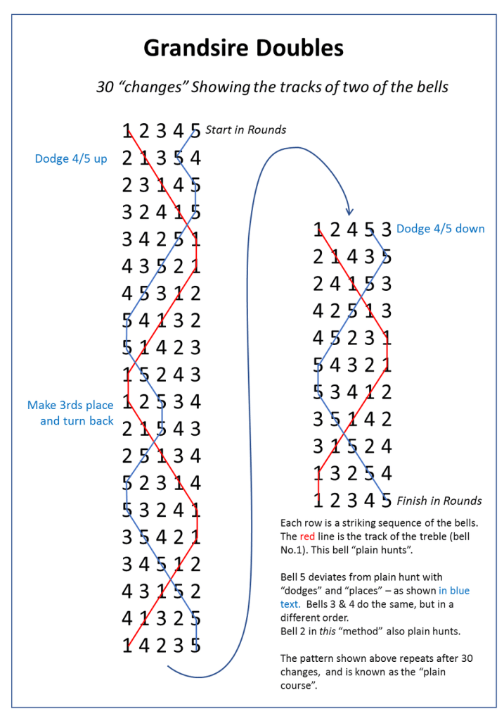 My understanding is that change-ringing has two main principles. Firstly, that every possible combination of the church’s bells must be rung once, and only once. Straight away, there’s the maths … a five-bell peal leads to 5! combinations (that’s five factorial, which is 1 x 2 x 3 x 4 x 5 = 120 – not the number 5 expressed with surprise). The second rule is that each bell’s position in the arrangement of five bells can only change by one (or not at all) each time. You couldn’t go from last to first, for example, there’s not enough time for the bell to ring and the rope to return to position to be rung again immediately after.