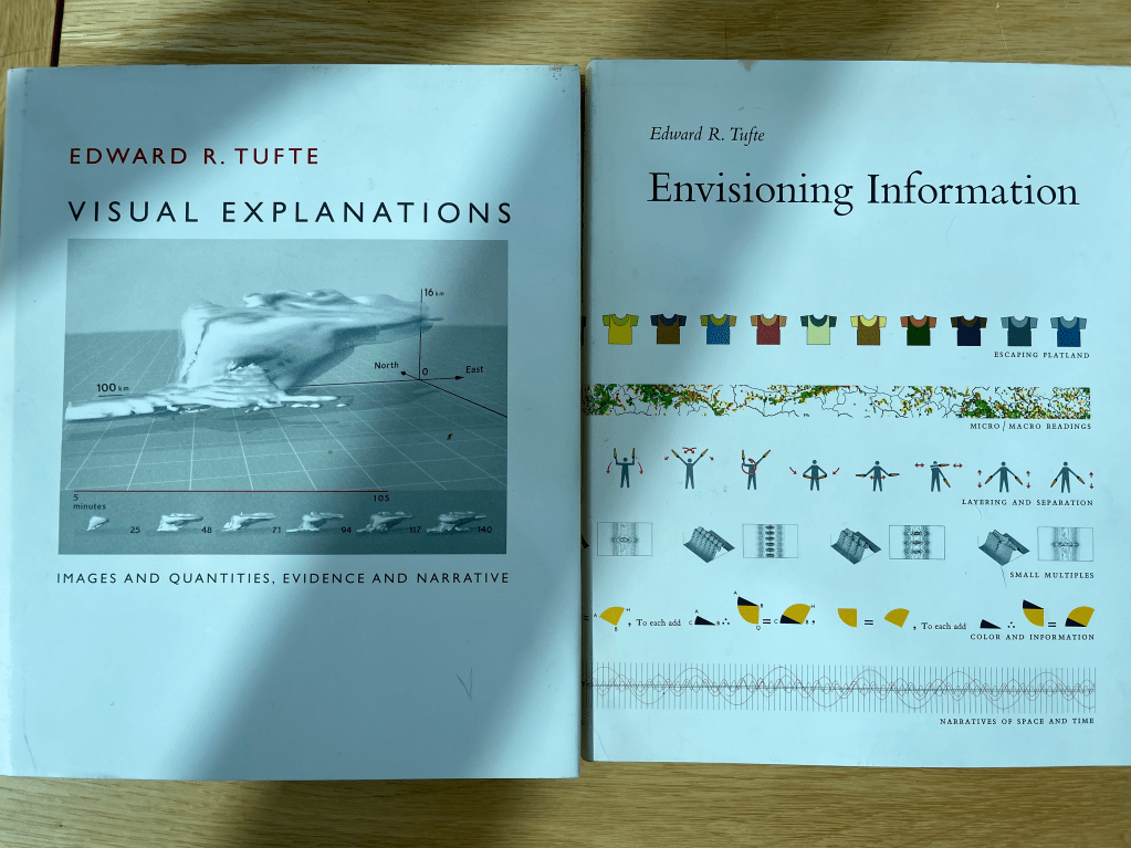 He was right – Tufte’s books are (or were) the perfect crossover between mathematics/academia and data visualisation. And, I’ll be honest, it was refreshing to explain data visualisation to a relative outside the field, and for them to perfectly understand what I meant straight away! I didn’t have the heart to say that much as I appreciate the correctness and principles behind Tufte’s work, I often then eschew these principles. They were two books I had never owned up until then, but I knew and appreciated that complemented my collection perfectly. I have now read them, and, more than that, I have cited them, fairly I hope, in my new book.
