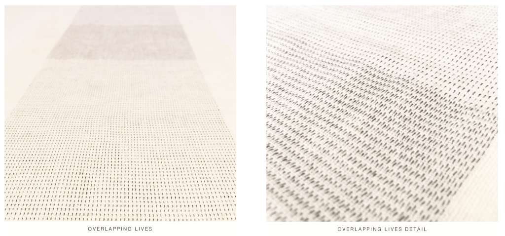 For example, this pair of images from “Overlapping Lives”. The work is described and featured within the book, although this pair of images comes from Jordan’s portfolio website at https://jordancunliffe.co.uk/home/work as they better depict the detail than my phone camera can do from physical book page photos – the appreciation of every hand-stitched datapoint emphasises the human dimension of “time taken to create” alongside the more standard representations of dimensions of quantity and area depicting time.